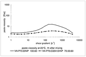 以Vinnolit P70糊樹(shù)脂與中等增塑劑量配成的漿料,在低(dī)剪力時(shí)顯示牛頓性流變,在高(gāo)剪力時(shí)會(huì)是中級的擴容型流變。加入摻混樹(shù)脂例如Vinnolit的C65V會(huì)馬上(shàng)減低(dī)或消除這種擴容性流變情況。